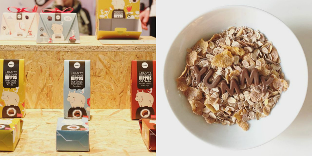 links Rückblick auf den Besuch der Int. Süßwarenmesse. Ich liebe hübsche Verpackungen, wie hier von Baru Choc. rechts Selbstgemachtes Schokomüsli nach einem Rezept von Maja aus ihrem Buch What’s for breakfast?*.