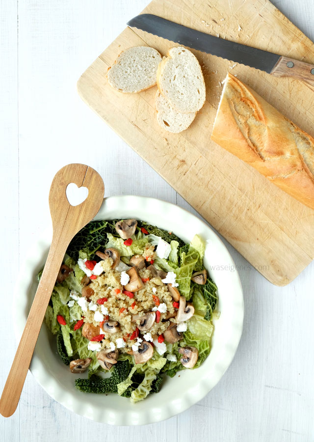 Ich dachte erst an Kohlrouladen- gute alte Hausmannskost- entschied mich aber dann doch dafür, mein Kohlgericht mit aktuell ganz heiß gehandelten Superfoods zu pimpen. Meine Idee: Lauwarmer Wirsingsalat mit Quinoa, Goji Beeren, Schafskäse und Champignons.