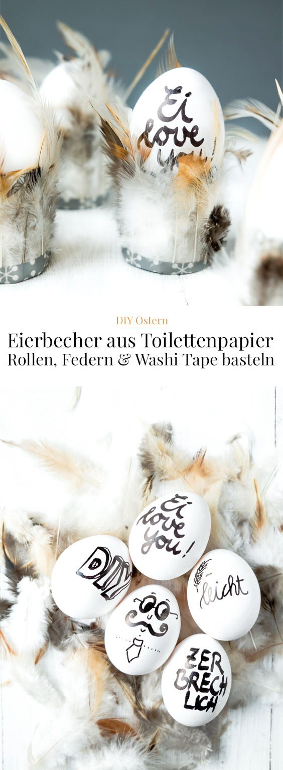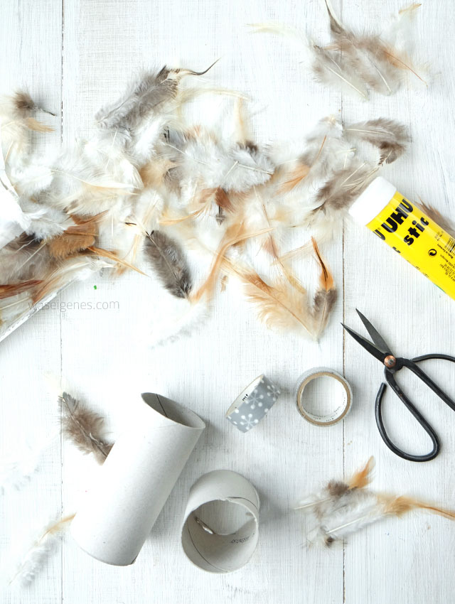 ich habe erst letztens ebenfalls aus WC-Rollen Eierbecher gezaubert (ohne Federn) – die sind echt super mega praktisch! :) Vor allem kann man die danach wegschmeißen und nehmen so nicht noch mehr Platz im Schrank weg, hehe ;D