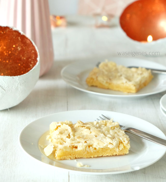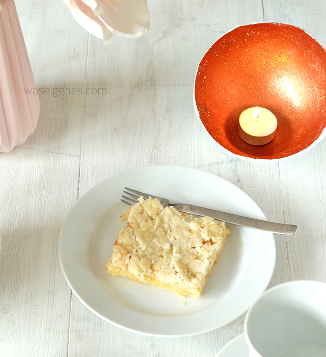 Die Butter schmelzen und alle weiteren Zutaten hinzugeben und gut verrühren. Sobald der Kuchen im Ofen fertig ist- er ist noch nicht ganz durchgebacken!- kommt die Butter-Zucker-Mandelmischung drauf. Ich habe sie portionsweise mit einem Esslöffel drauf verteilt und dann vorsichtig mit einem Messer verstrichen.