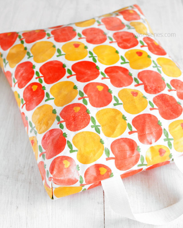 Und genau für diesen Fall habe ich mir am letzten Wochenende ein DIY Kniekissen für den Garten genäht. Das Kissen wollte ich aus beschichtetem Stoff nähen, den ich aber gar nicht habe. Mein Bastel-Stoff-Krimskrams-Regal ist voller vieler Sachen, aber ein beschichteter Stoff ist nicht dabei. Und deswegen habe ich meinen geliebten retro Apfelstoff selbst laminiert. Die Idee habe ich von einer Nähkränzchen-Freundin.