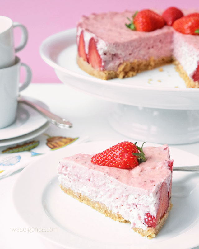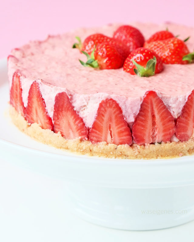 Daraus oder damit habe ich dieses leckere No Bake Erdbeertörtchen gebacken. Ein bisschen frei nach Schnauze, ein bisschen nach Rezept und inspiriert durch die vielen wunderschönen Torten, die ich auf Foodblogs immer bewundere. Eigentlich wollte ich ein Törtchen backen, auf dem viele viele Erdbeeren und am besten noch Blumen liegen. Ihr wisst, was ich meine? Aber ehrlich, wie soll man denn so eine Torte vernünftig anschneiden?
