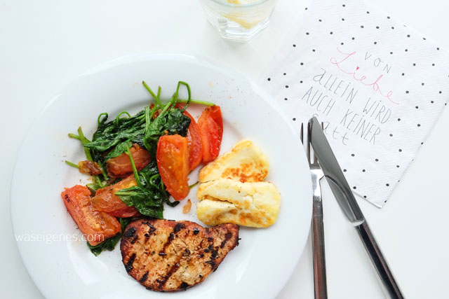 Von Liebe allein wird auch keiner satt. Trotz Wetter grillen wir. Dazu gibt’s gebratene Tomaten und Blattspinat sowie Quietschekäse.