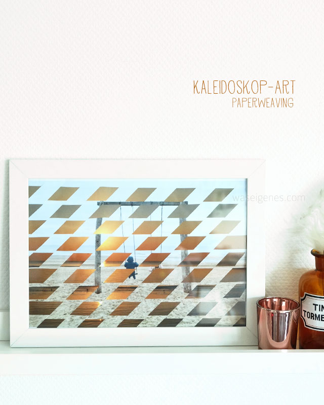Dem oben gezeigten paper weaving ging übrigens ein paar Tage vorher schon ein zweiter Versuch voraus. Dabei hatte ich zwei Bilder im Querformat ausgedruckt. Der Effekt kommt da leider nicht so rüber. Auch hatte ich zwei zu unterschiedliche Bilder ausgewählt. Das eine blass-blau, das andere kräftig gold-braun. Der Farbunterschied ist zu krass, als dass da eine Art Kaleidoskop-Effekt entstehen könne.