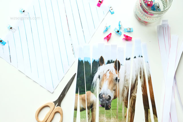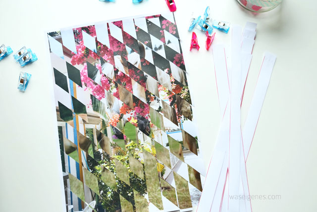 Am nächsten Tag schritt ich gleich zur Tat, druckte zwei Fotos (eines von meinem Trip ins Allgäu und eines aus Gran Canaria) und die Schnittvorlage aus, kramte diese praktischen Clips hervor und schnitt meine Fotos in schmale Streifen.