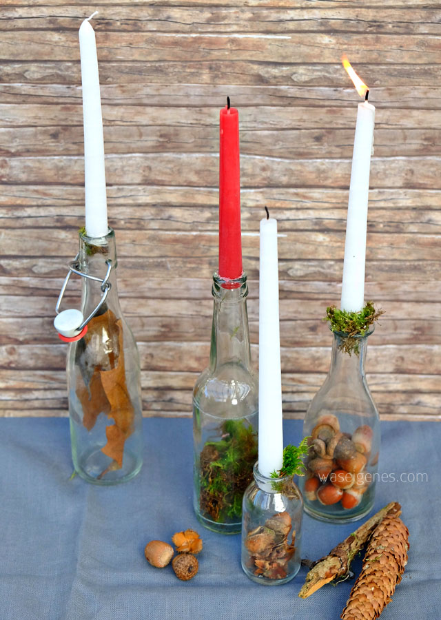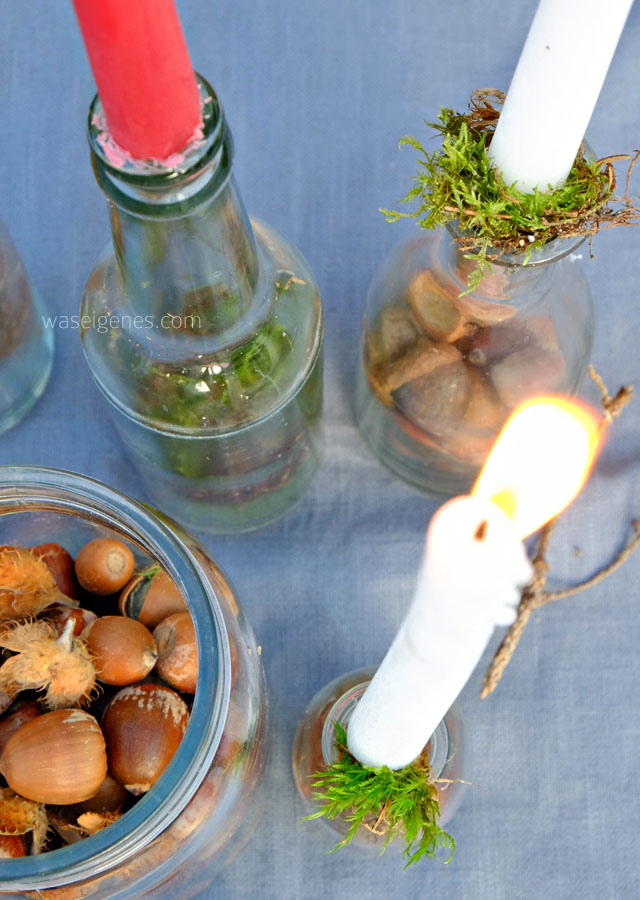In diesem Jahr habe ich die Fundstücke aus dem Wald in Flaschen gestopft und obendrein Kerzen gesteckt. Die Idee könnte schon als eine Art Adventskranz durchgehen- aber nein, dafür ist es noch zu früh. Ausserdem stehe ich ja auf klassische runde Kränze. Wobei ich in den vergangenen Jahren oft eine lange schmale Schale mit Kerzen und Nippeskram dekoriert habe, weil so ein runder Kranz so viel Platz auf dem Tisch wegnimmt.
