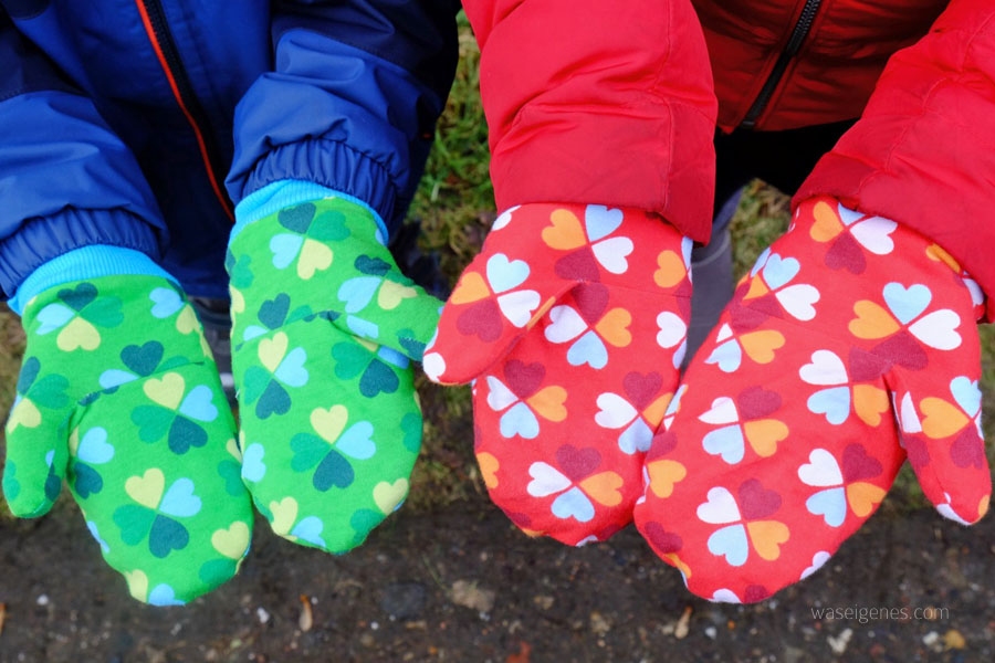 Die Kinder finden die Fäustlinge super, denn darin bleiben die Händchen viel besser warm, als in den Strick-Finger-Handschuhen, die sie sonst immer tragen. Die grünen Fäustlinge habe ich mit blauem Frottee gefüttert, die roten mit einem anderen, recht dickem Jersey.