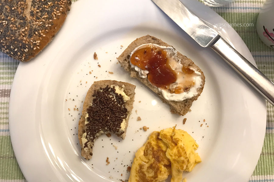 Dann gib’s erstmal Frühstück. Am Wochenende immer Rührei. Zum hübsch Arrangieren meines Brötchens habe ich keine Lust.