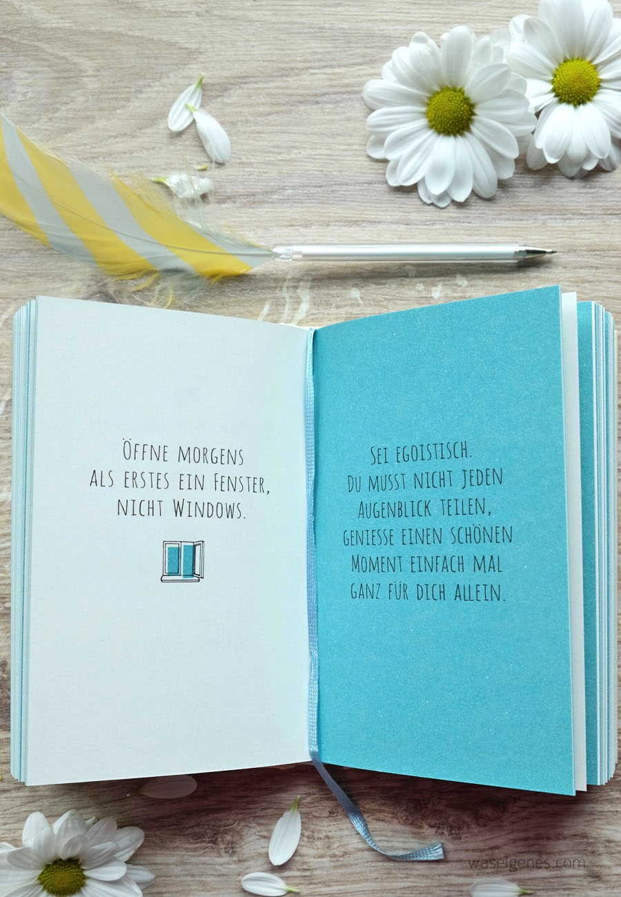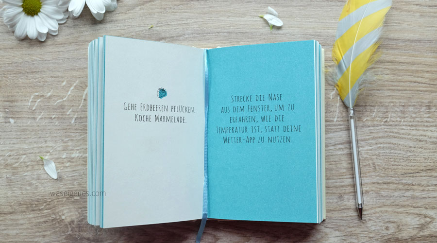 Auf jeder Seite steht eine Aufforderung oder eine Idee. Und beim Lesen der vielen Aufforderungen dachte ich: Ja, recht hat er, der Julius Hendricks, der irgendwo in Köln in einer Buchhandlung arbeitet und seinen Freunden immer Bücher schenkt. Mehr habe ich über den jungen Mann im Netz nicht finden können, denn oh Wunder- ein Facebook Profil hat er nicht. Auch kein Smartphone. Ein bisschen schräg finde ich das und absolut bewundernswert.