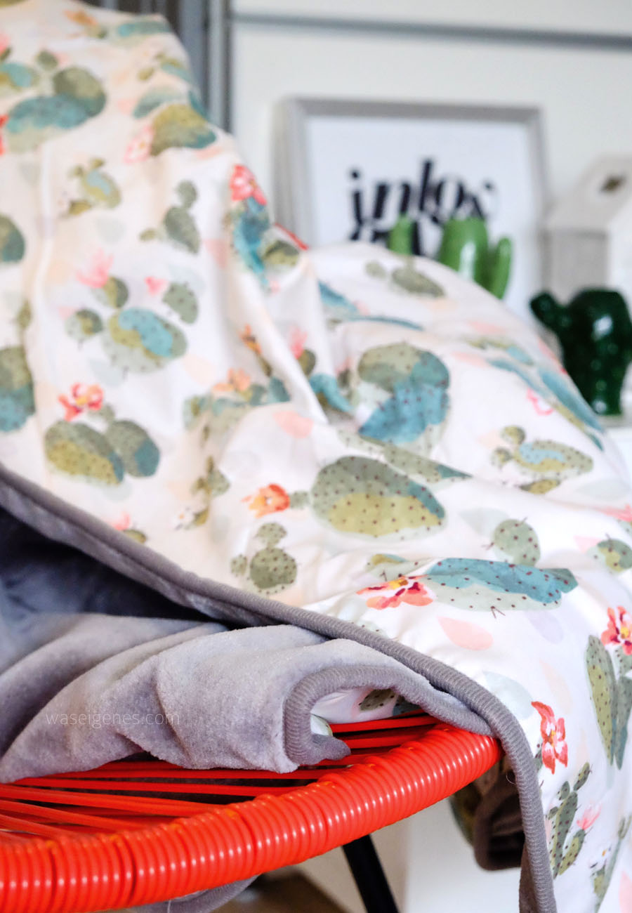Ich sehr wohl, denn während des Übergangs ist mir tagsüber warm und abends habe ich kalte Füße. Deswegen brauche ich eine Übergangsdecke, deren eine Seite sommerliche Kakteenprints zieren und deren andere Seite meine kalten Füße wärmt.