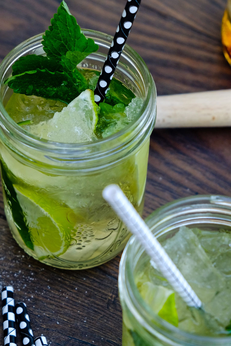 Ich habe dann noch mehr Minze und Limettenviertel mit ins Glas gesteckt. Wirkt auf den Fotos noch besser und läßt mein Lieblingsgetränk gleich noch viel gesünder und frischer aussehen. Ausserdem mag ich es, ganze Minzblätter aus dem Cocktail zu fischen und zu kauen.
