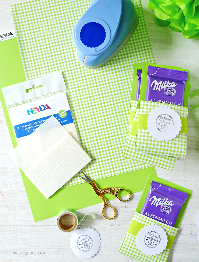 Aus dem karierten Papier schnitt ich zunächst die “Taschen” zu. Darauf legte ich die Milka, faltete den unteren Teil nach oben und legte dann einen schmalen uni-grünen Streifen quer drauf, faltete diesen nach hinten und klebte ihn mit Washi Tape fest. Wie gut, dass der Mann mal vor Jahren eine Schneidemaschine angeschafft hat. Ich brauche sie selten, aber an dem Tag war ich dafür echt dankbar!