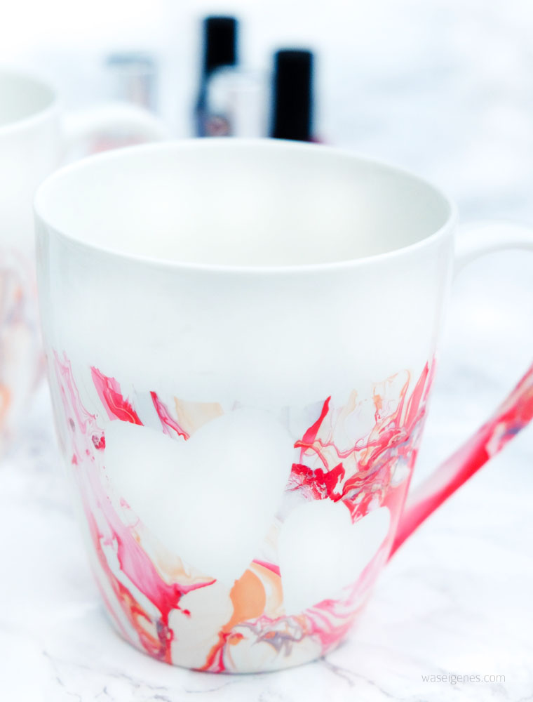 Dazu kam der Geistesblitz mit der Bucheinbandfolie*! Aus dieser habe ich Herzen ausgeschnitten, die ich vor dem Marmorieren auf die Tassen geklebt habe. Dann habe ich die Tassen flott in Wasser und Nagellack getunkt, ein paar Stünchen trocknen lassen und dann die Folie wieder abgezogen.