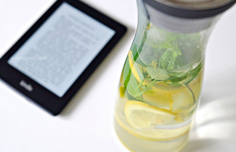 Mit auf dem Bild: mein aktuell liebstes Getränk. Wasser mit Zitronen und Minze.