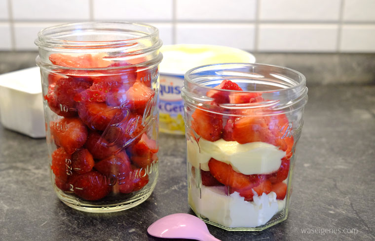 Und schon ist es kurz nach halb sieben. Der Mann weckt die schlafenden Mäuse, ich fülle die Frühstücksgläser für die Schule. Einmal mit Quark, einmal ohne, bitte. Aber gerne! Euer Wunsch ist mir Befehl.