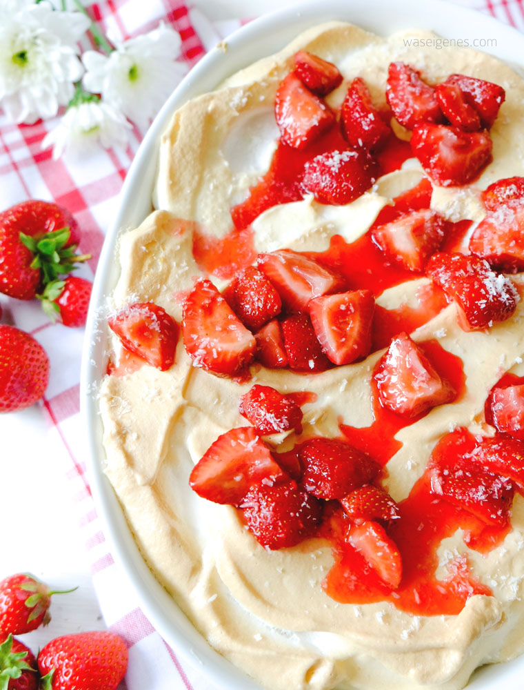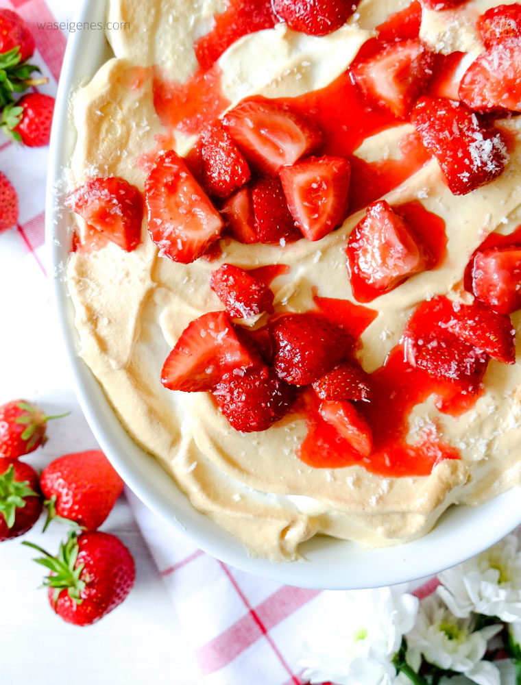 Die Erdbeeren auf den fertigen Auflauf geben und dann heißt es nur noch genießen. Egal, ob warm aus dem Ofen, zimmerwarm ein paar Stunden später oder kalt aus dem Kühlschrank am nächsten Tag- schmeckt lecker! ;-)