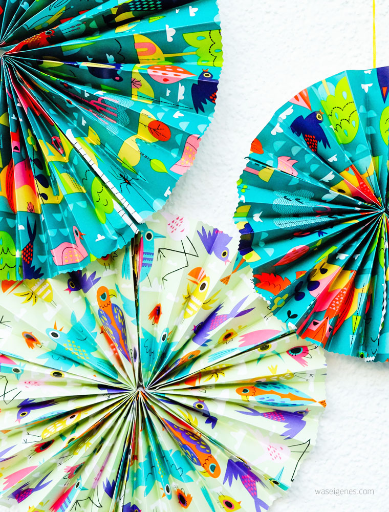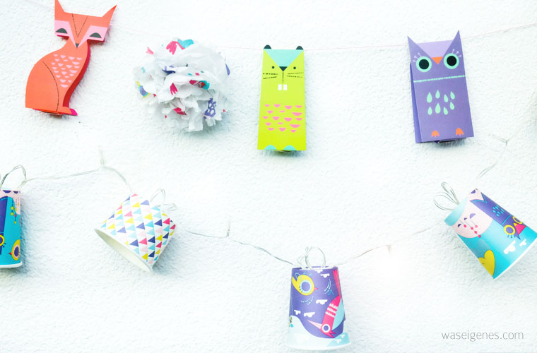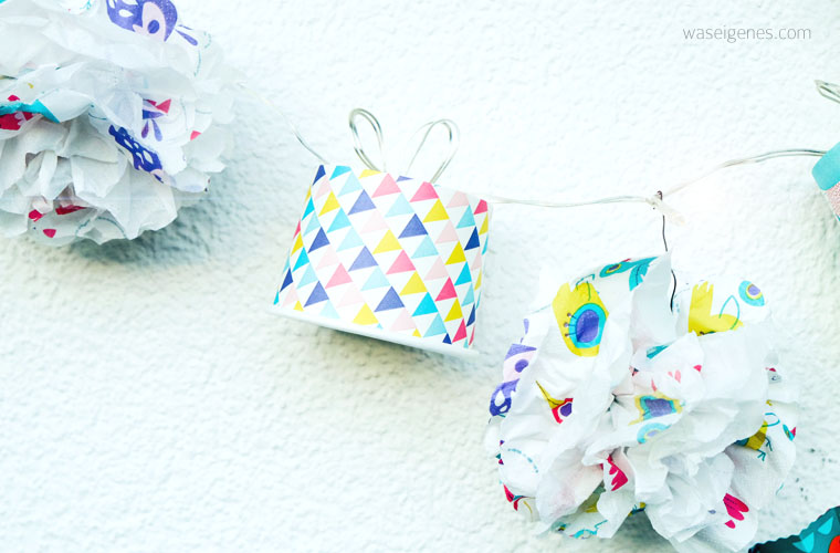 Aus den Trink- und Eisbechern habe ich eine Lichterkette gebastelt, aus dem Geschenkpapier Rosetten, aus den Servietten kleine Pompoms.