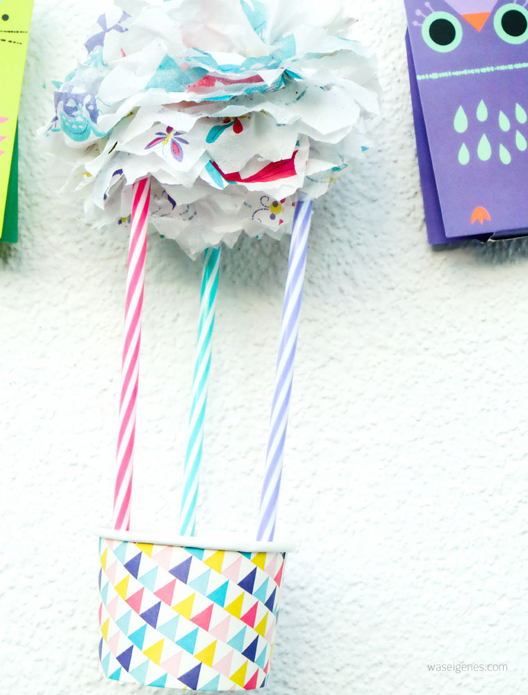Die beste Idee hatte das Tochterkind, die, während ich im Nebenraum fluchend die Servietten auseinander friemelte, um aus den hauchdünnen Lagen Pompoms zu basteln, einen kleinen Heißluftballon bastelte.