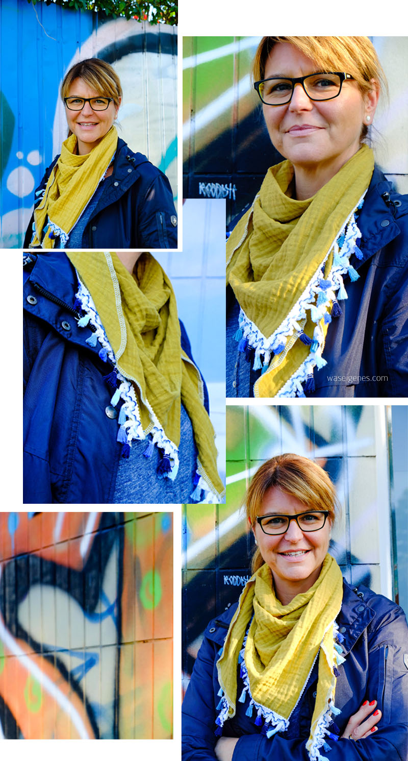 Die Quasten sind aus dem Onlineshop wunderpop. Ich hatte mir extra eine blaue Quasten bestellt, denn meine Übergangsjacke (ich sehe gerade einen Augen rollenden Mann vor seinem Bildschirm! Männer können mit dem Wort Übergangsjacke nämlich nix anfangen)… auf jeden Fall ist meine Übergangsjacke blau. Und blau und senfgelb ergeben eine hübsche Kombi, finde ich.