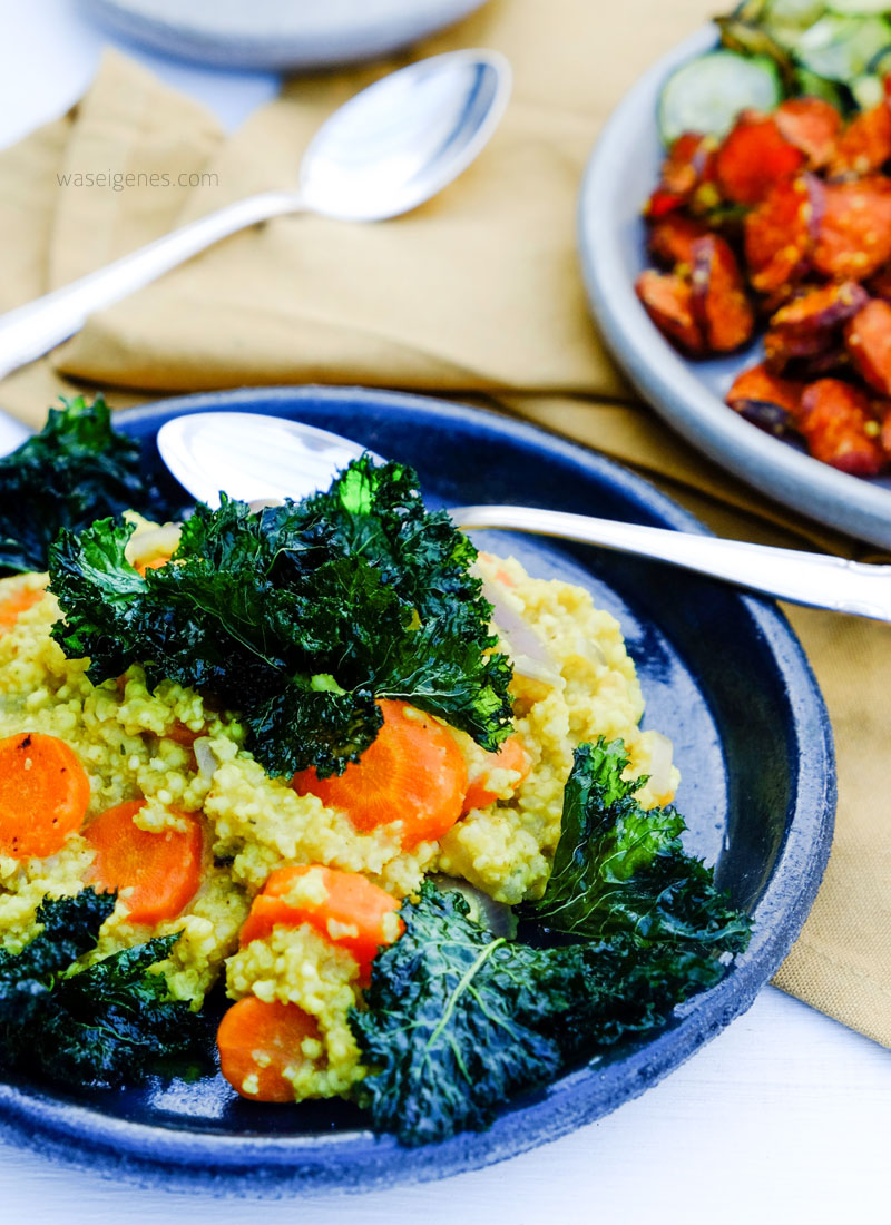 Hirse Möhren Pfanne mit Curry und Grünkohl Chips