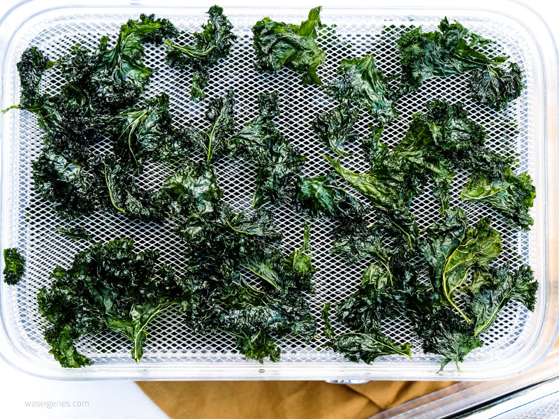 Und das machte ich. Chips aus Süßkartoffeln (haben mich nicht zu 100% überzeugt), Chips aus hauchdünnen Zucchinischeiben (sehr sehr lecker) und Chips aus Grünkohl. Grünkohl Chips! Der Gipfel meiner Glückseligkeit, denn ich esse sowas unglaublich gerne. Ich habe mir schon manches mal Gemüsechips gekauft, habe mich aber immer über den geringen Inhalt in diesen aufgeplusterten Tüten geärgert; vom Preis mal ganz abgesehen. Gut, jetzt, wo ich weiß, wie lange es dauert Gemüse zu dörren, mag der Preise seine Berechtigung haben, aber Freude kommt da beim abendlichen Snacken nicht auf.