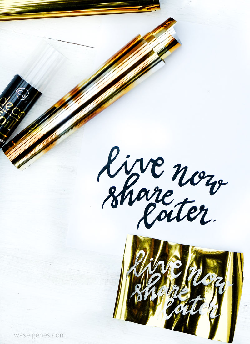 Zunächst habe ich mit der Hand den Spruch “live now share later” auf weißem Druckerpapier geschrieben, diesen eingescannt und dann wieder mit einem Laserdrucker ausgedruckt. Selbstverständlich könnt Ihr Euren Schriftzug auch einfach am Computer erstellen und ausdrucken. So habe ich es bei dem Schriftzug “good vibes only” gemacht.