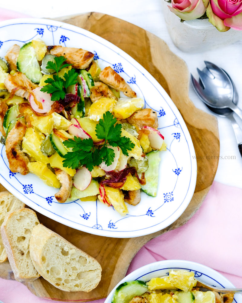 Eigentlich lasse ich ja nichts auf den Kartoffelsalat meiner Mama kommen- den ich, warum auch immer? hier noch nie verbloggt habe – aber dieser hier, dieser lauwarme Kartoffelsalat mit karamellisierten Zwiebeln, mit frischer Salatgurke und würzigen Gürkchen, mit Radieschen und Putenschnitzel, der ist in unserer persönlichen Liga der liebsten Gerichte jetzt unter den ersten 10. Bäm!