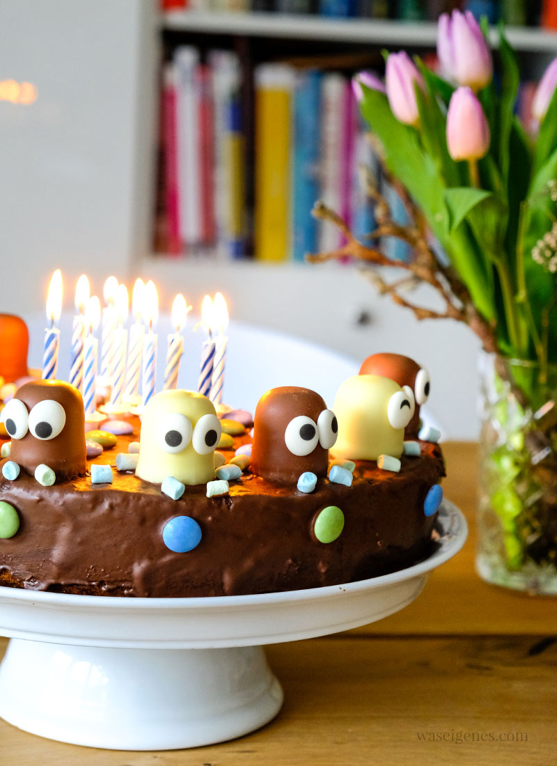 Den beschnittenen Kuchen habe ich dann mit Schokolade überzogen und darauf 12 kleine Schokoküsse gestellt. Vorher habe ich den Schokoküssen aber noch Augen verpasst. Die habe ich zufällig in der Backabteilung gefunden. Aufgeklebt habe ich sie mit Zuckerschrift aus der Tube. Dazwischen habe ich grüne und blaue Smarties und mini Marshmallows auf den Kuchen gelegt, bzw. geschmissen. 10 Kerzen drauf, feddich.