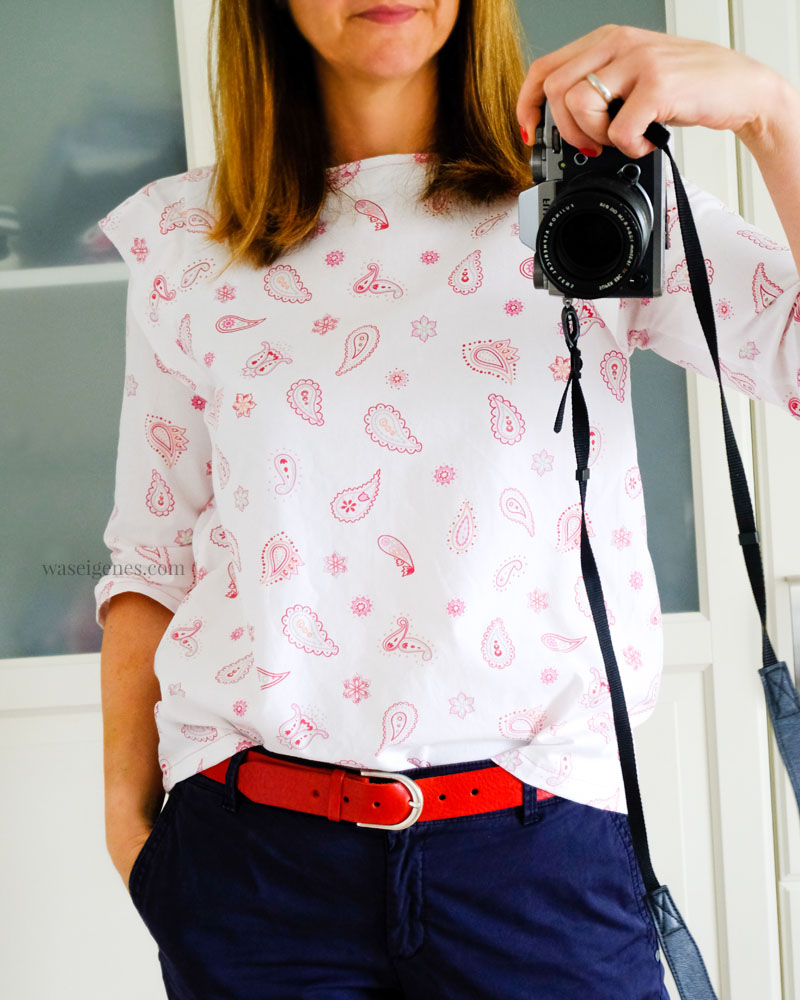 Der Schnitt ist toll, aber der von mir ausgewählte Stoff nicht der Richtige. Er ist zu fest und zu steif. Das könnte daran liegen, dass …. soll ich es tatsächlich schreiben? Soll ich mit der Wahrheit rausrücken? Ach komm, ehrlich währt am längsten: es ist Bettwäsche. Ausrangierte Bettwäsche. Als das Schnittmuster für Frau Smilla raus kam, fiel mir die Bettwäsche ins Auge, die schon ein Weilchen in meinem Nähzimmer liegt und eigentlich darauf wartet, dass ich sie zu einem Heinrich Einkaufsbeutel vernähe. Nun ist sie eine Bluse.