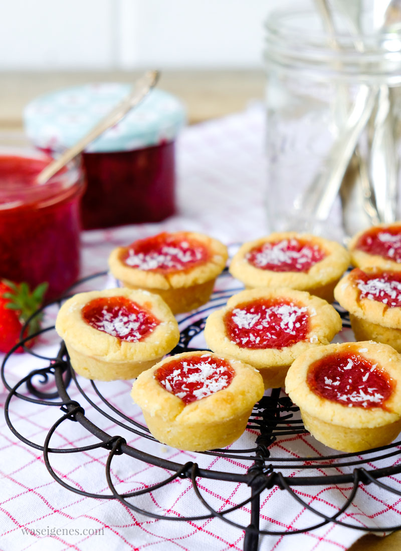 Die Marmeladentörtchen ca. 25- 30 Minuten im Ofen backen. Vor dem Servieren mit Puderzucker oder Kokosstreusel bestreuen.