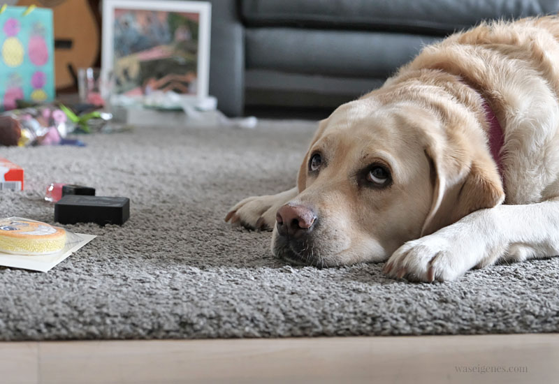 Als wir wieder nach Hause kommen liegt Mollie auf dem (ihrem) Wohnzimmerteppich und fragt sich sicherlich, was das ganze Zeug da soll. Nicht nur den Nagellack findet sie uninteressant, auch die Süßigkeiten interessieren sie nicht die Bohne. Ich tippe auf Gendefekt oder kennt Ihr einen Labbi, der sich so eine Chance entgehen lassen würde?