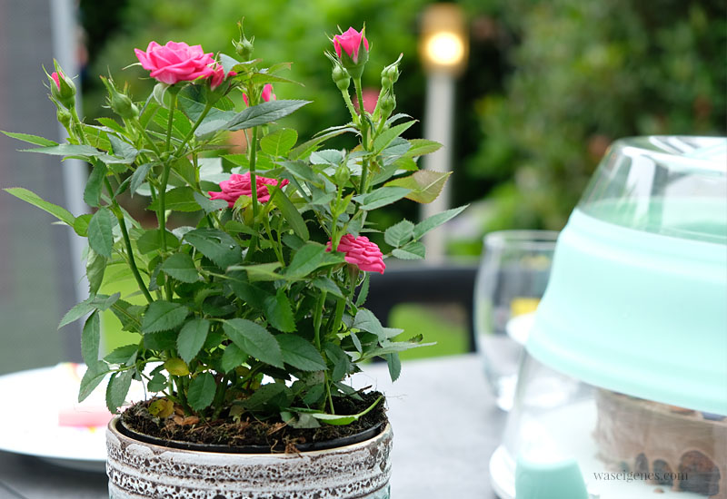 Der Kuchen ist fertig, raus in den Garten, Tisch decken und ein bisschen dekorieren. Die Röschen habe ich vom Einkaufen mitgebracht. Sie dienen der Tischdeko und ich frage mich, ob ich sie später vielleicht irgendwo ins Beet pflanzen kann? Ich habe noch nie Rosen im Garten gehabt, bewundere sie immer nur bei den Nachbarn.