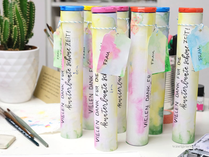 Die OGS Erzieherinnen und Betreuerinnen haben Smarties-Abschiedsgeschenke bekommen. Dafür habe ich zunächst ein weißes Blatt mit Auquarellfarben bemalt und mit schwarzem Stift “Vielen Dank für die kunterbunte schöne Zeit” geschrieben. Das habe ich kopiert und um die Smarties Rolle geklebt. An alle Rollen habe ich dann kleine Aquarell-Namensschilder gehängt.