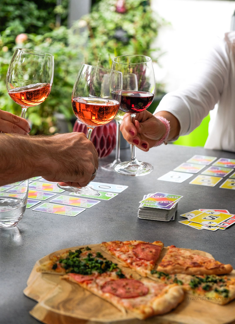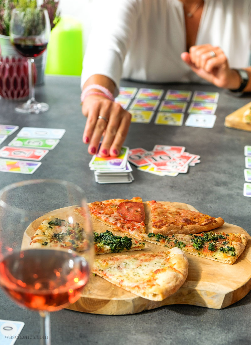Knusprige Pizza, ein Glas Wein und Spielen mit Freunden