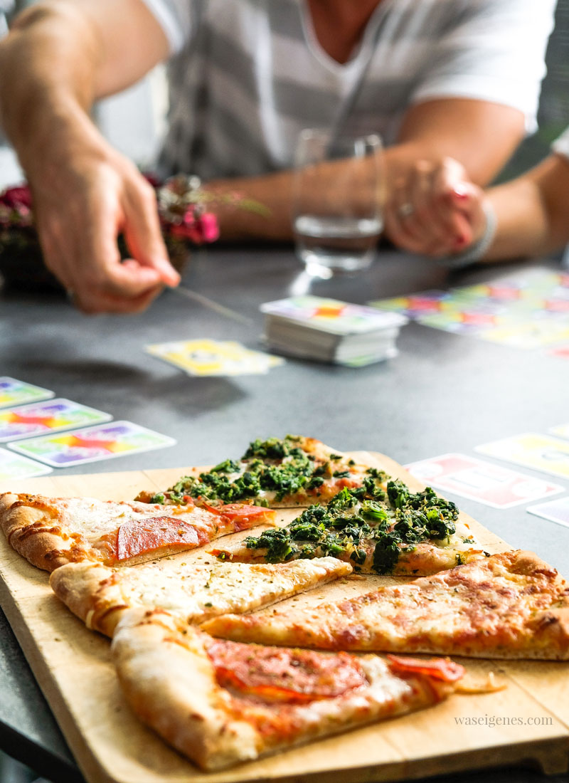 Als ich noch klein war, brachte uns das Christkind manchmal das Spiel des Jahres. Sagaland und Scotland Yard waren jahrelang meine absoluten Favoriten. Mit meiner Oma spielte ich immer Mühle und als meine Schwester und ich dann älter wurden und endlich mehrere Spielkarten in unseren Händen halten konnten, spielten wir stundelang mit und gegen unsere Eltern Rommé. So ein Spielenachmittag oder -abend war also immer sehr beliebt bei uns, aber Pizza gab’s bei uns zu Hause nie. Bütterchen standen dann auf dem Tisch. Bütterchen mit Gürkchen und Pfefferminztee.