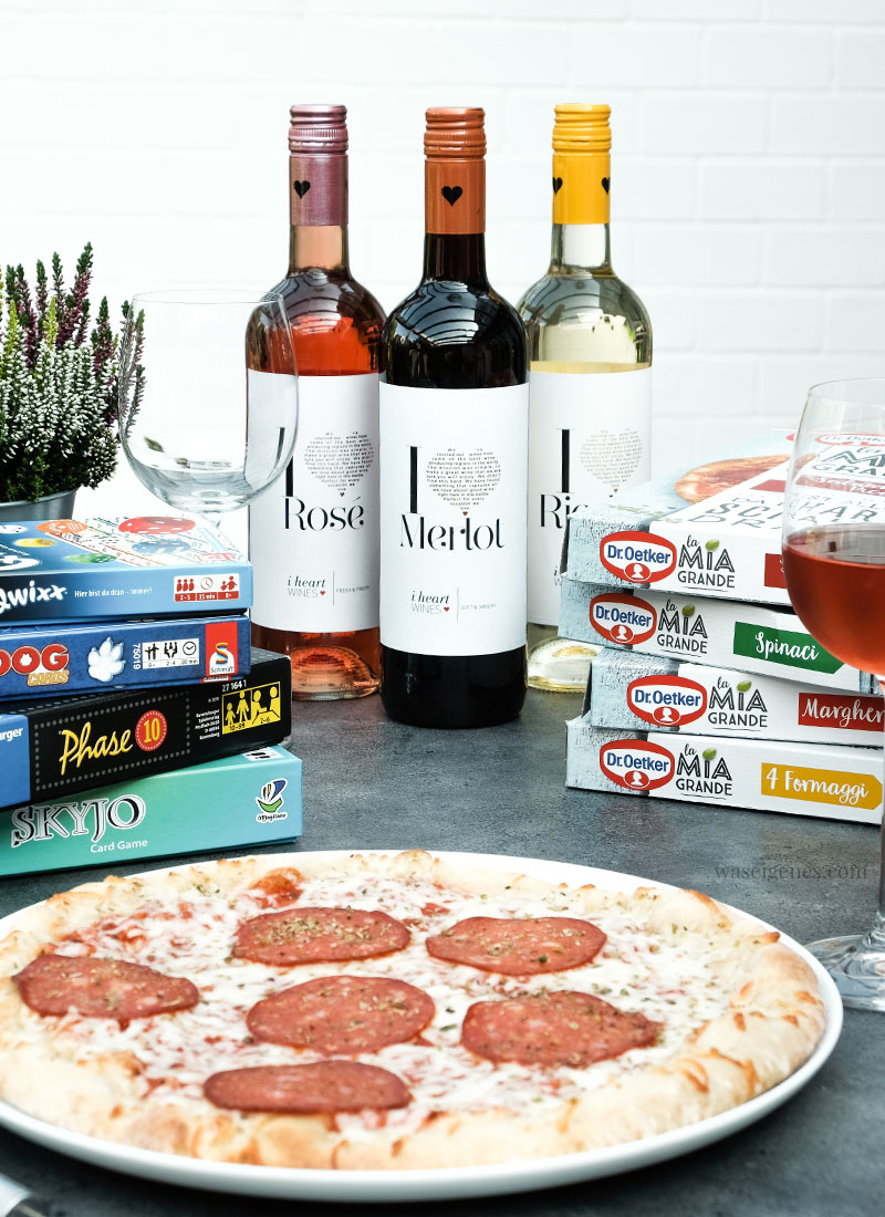 Als in meinem Postfach die Anfrage eintrudelte, ob ich die neuen Tiefkühlpizzen La Mia Grande von Dr. Oetker sowie die I heart Wines* Weine von Henkell probieren wolle, antwortete ich sofort: gerne, aber ich brauche reichlich! Statt mich mit Pizza und Wein allein vor die Glotze zu setzen, lud ich lieber unsere Freunde zum gemeinsame Spielenachmittag und Test-Essen und -Trinken ein.