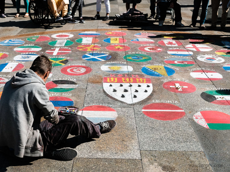 Das ist Kölner Irrsinn: Die Philharmonie liegt unterirdisch unter dem Heinrich-Böll-Platz. Die Geräusche, die Menschen beim Gehen, beim Koffer-hinter-sich-herziehen oder beim Skaten verursachen, sind in der Philharmonie darunter zu hören und deswegen wird der Platz bei Konzerten, Proben oder Aufnahmen seit Jahren mehrmals am Tag gesperrt. So ungefähr 1.000 mal im Jahr. Und immer steht Wachpersonal am Rande des Platzes und verweist die Touristen an den Rand. Unglaublich, aber wahr! An diesem Tag fand gerade nix in der Philharmonie statt, deswegen durften wir kreuz und quer über den Platz laufen.