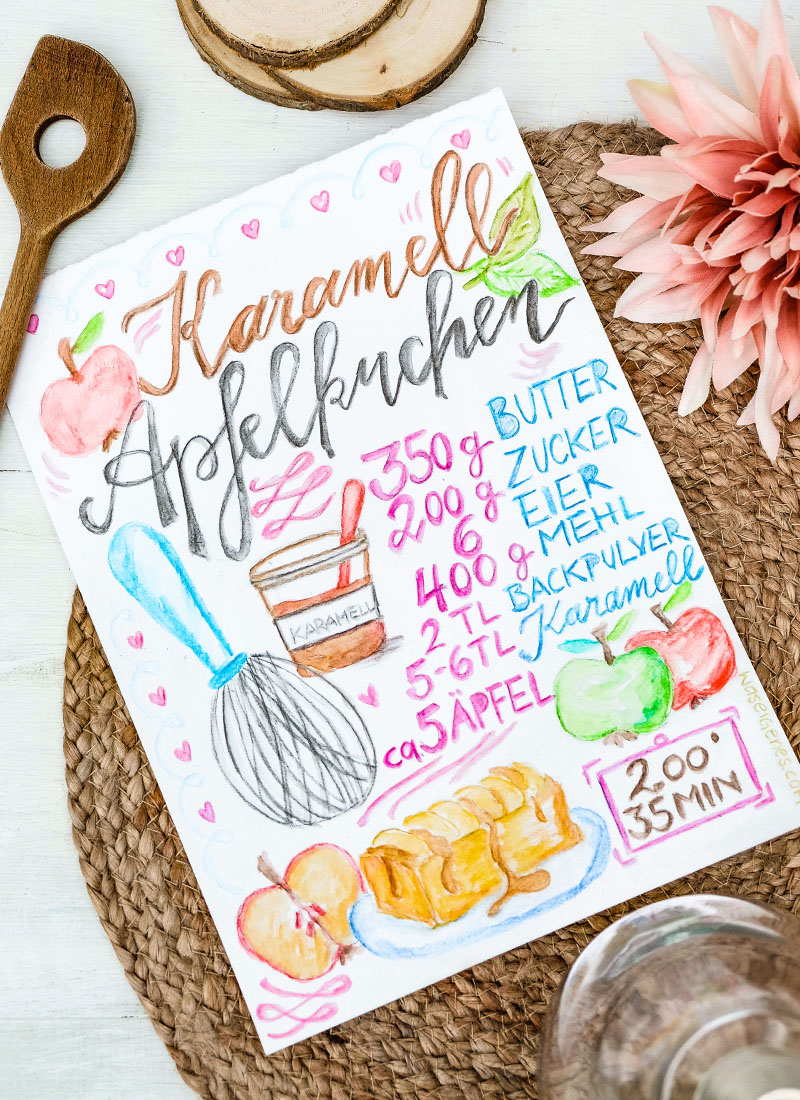 Bei meinem gemalten Rezept habe ich mich mit der Karamellangabe etwas verhauen. Wie Ihr oben auf dem Bild seht, habe ich acht Karamellkleckse auf den Teig gegeben, als ich das Rezept malte, habe ich 5-6 TL aufgeschrieben. Fragt mich nicht, warum! Geistige Umnachtung? Eine Überdosis Karamell-Apfelkuchen? Ich weiß es nicht.
