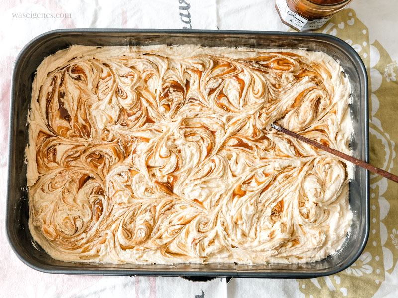 - Den Teig in eine gefettete Springform geben und ca. 8 Teelöffel Karamell-Kleckse darauf geben. Mit einem Schaschlikstäbchen oder einem Essstäbchen das Karamell in den Teig wirbeln.