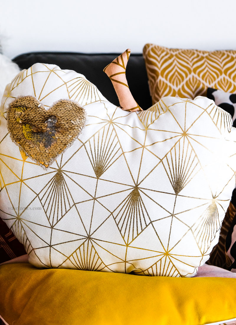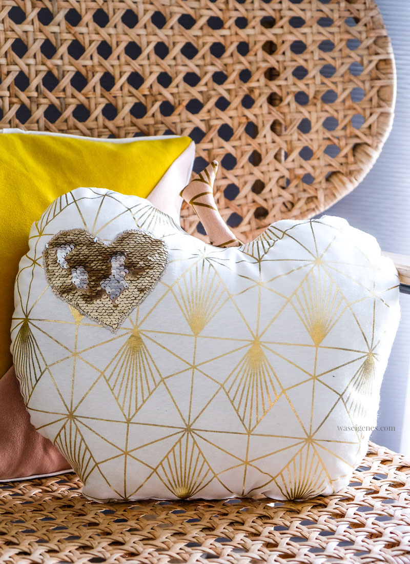 Passend zur Jahreszeit und meinem derzeitigen Apfeljieper habe ich auch noch kleines Apfelkissen genäht. Dem habe ich noch ein Paillettenherz verpasst. Den Paillettenstoff habe ich im März bei der Creativa gekauft. Seitdem wartete er auf Verarbeitung.