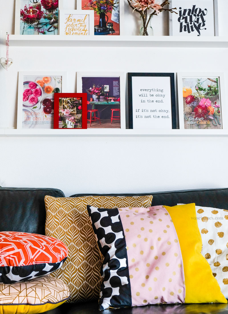 Als die neuen Kissen dann alle auf dem Sofa lagen, nahm ich die Bilderleiste in Angriff. Die meisten Bilder stammen aus Wohnzeitschriften, von denen ich fünf bis sieben Meter hohe Stapel in meinem Nähzimmer horte. Das ist eine ganz schlimme Angewohnheit von mir. Ich kann Zeitschriften nicht gut wegschmeißen. Einen Vorteil hat mein Sammelwahn: ich hab immer genügend Nachschub für die Bilderleiste.