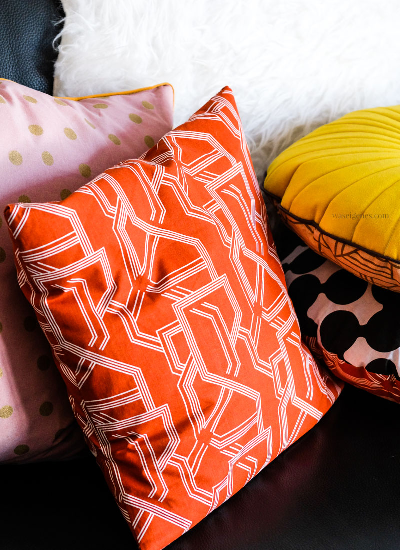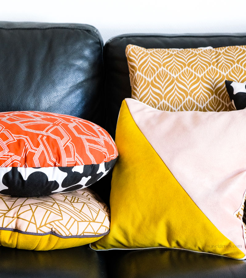Die Kombi aus senfgelb, altrosa, schwarz und gold finde ich (zum jetzigen Zeitpunkt) richtig klasse. Das ändert sich bei mir ja immer mal wieder. Regelmäßige was-eigenes-Leser wissen, dass ich hier gerne in nähverrückten Anfällen ratz fatz die Wohnzimmerecke einmal auf den Kopf stelle und neu dekoriere. Dabei bin ich sonst gar nicht so die Dekotanten. Aber Kissenbezüge nähe ich für mein Leben gern.