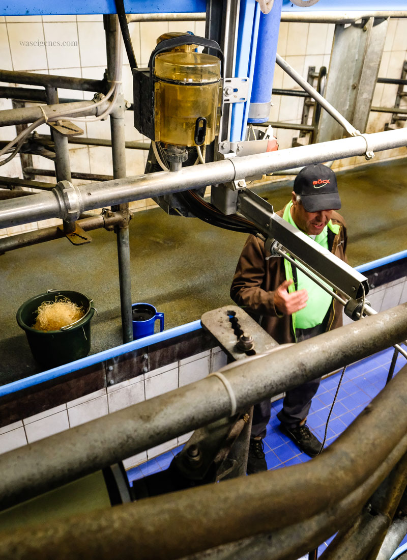 Die drei führten uns durch die Ställe, zeigten uns die täglichen Futterrationen einer einzelnen Kuh (wusstet Ihr, dass eine Kuh 80 Liter Wasser am Tag trinkt? Unfassbar!) … marschierten mit uns auf die Weide und beantworteten uns alle Fragen.