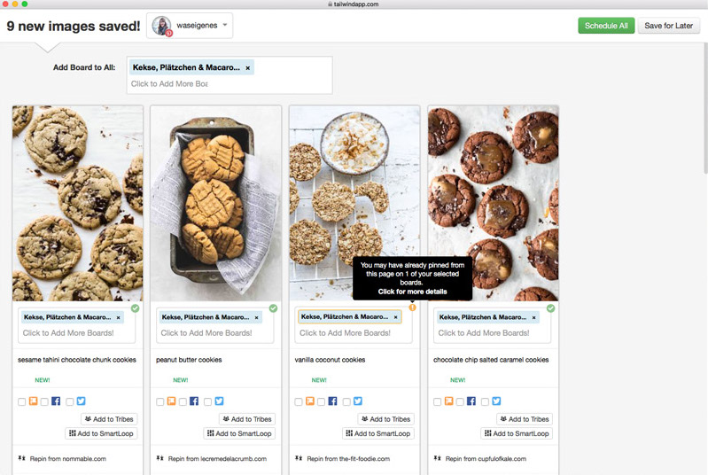Nachdem ich auf “Go schedule” geklickt habe, öffnet sich wieder ein neues Fenster. Dort kann ich nun ganz oben das Board eingeben, auf welches ich die Bilder pinnen möchte. In diesem Fall “Kekse, Plätzchen & Macarons”. Bilder, die ich schon einmal gepinnt habe (woran ich mich aber nicht erinnere) erkenne ich an dem gelben Ausrufezeichen. Diese Bilder lösche ich dann aus dem “Planungsfenster”. Doppelt Pinnen ist doof. Einfach mit der Maus über das Bild fahren, es erscheint ein kleiner Papierkorb.