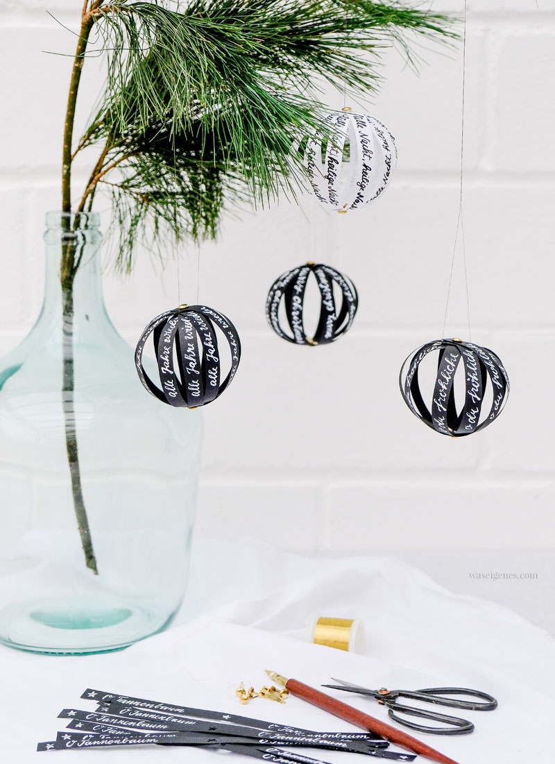 Zum Schluss einen dünnen Faden zwischen die einzelnen Steifen ziehen, zusammenbinden und in den Baum oder an einen Ast hängen. Fertig ist die Baumschmuck Papierkugel mit handgeschriebenen Botschaften.