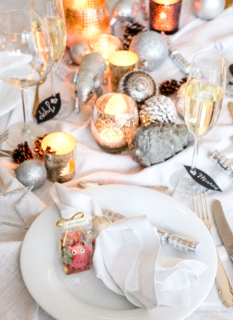 Für die Tischdekoration habe ich alles, was funkelt und glitzert aus den Tiefen unseres Kellerschranks befördert. Kugeln, Teelichtgläser, Glücksschweinchen und Serviettenringe. Die Knallbonbons hat mir eine Freundin für`s Foto geliehen.