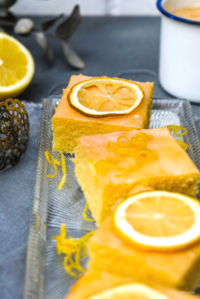 - Den Kuchen etwas abkühlen lassen. Puderzucker und Zitronensaft mischen und über die Zitronenschnitten gießen oder mit einem Pinsel streichen.