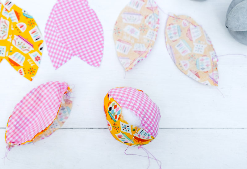 4.) Wende das Ei durch die Wendeöffnung, fülle es mit Füllwatte und nähe mit der Hand und dem Matratzenstich die Wendeöffnung zu.