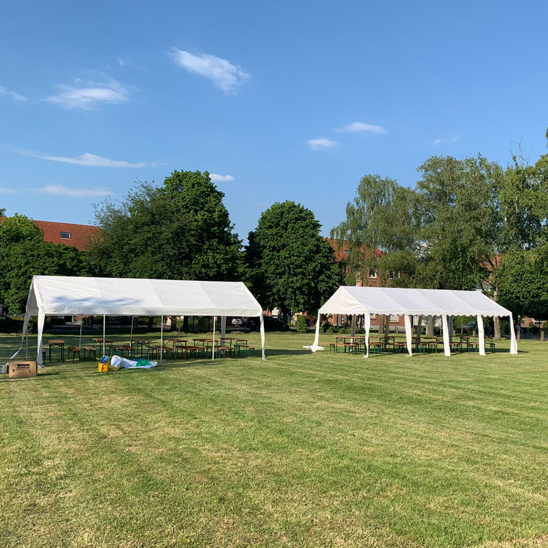 Am Mittwochabend bauen wir sieben Pavillons, einen Bier (Getränke)- und einen Grillwagen auf und am Donnerstag geben sich 16 Mannschaften auf der Kirchwiese ein heißes Match. Diese Menschenkicker – oder wie sie an diesem Tag heißen: Männerkicker, sind genial! Ich sach immer: Hüpfburg für große Jungs.