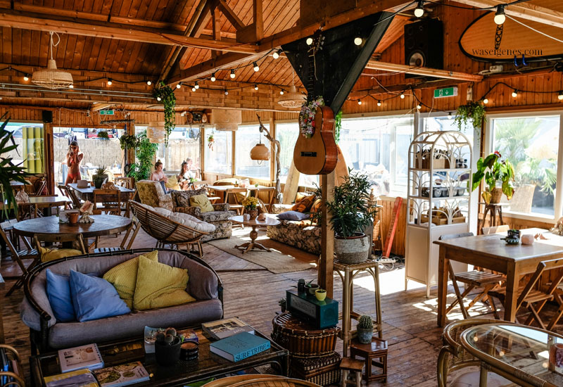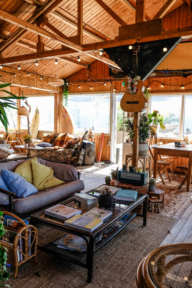Viel Holz, viel Rattan, gemütliche Sofas, ohne Ende Pflanzen und Surfbretter. Klaro- gleich neben der Bude befindet sich eine Surfschule. Alles sehr lässig und entspannt dort.